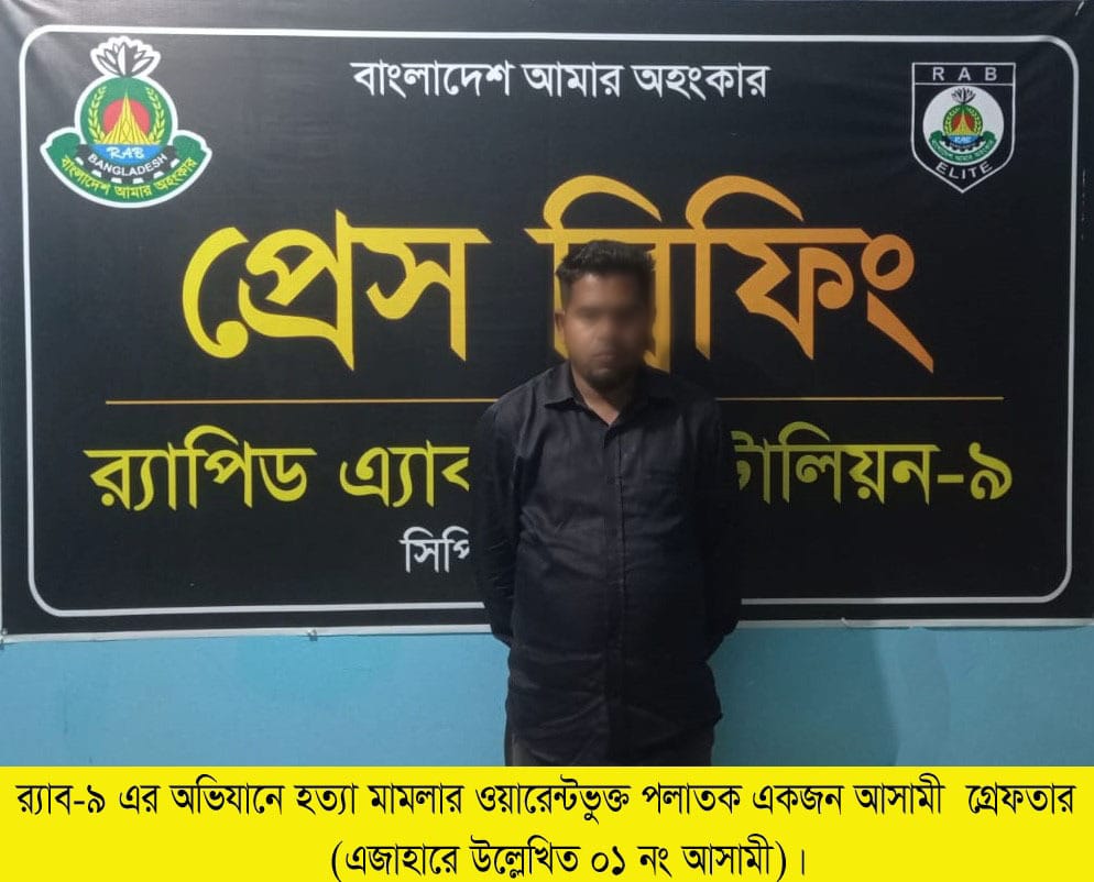 র‍্যাব-৯ এর অভিযানে সিলেটের বালাগঞ্জে ‘শামীমা বেগম’ হত্যা মামলার ওয়ারেন্টভুক্ত পলাতক প্রধান আসামি মৌলভীবাজার থেকে গ্রেফতার